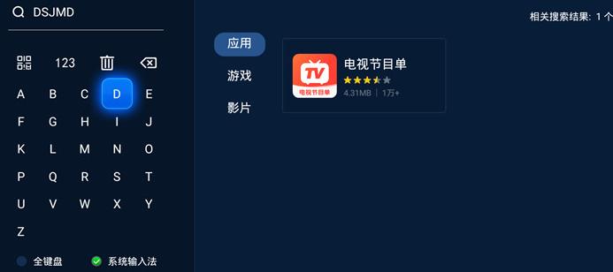 四.完成安装后,打开当贝市场,里面的应用就可随意下载了。比如想要下载电视直播软件,只需搜索输入“DSJMD”就可找到对应安装包了。
