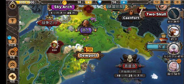 战斗日志、排行榜、铁匠铺、军营、升级、地图