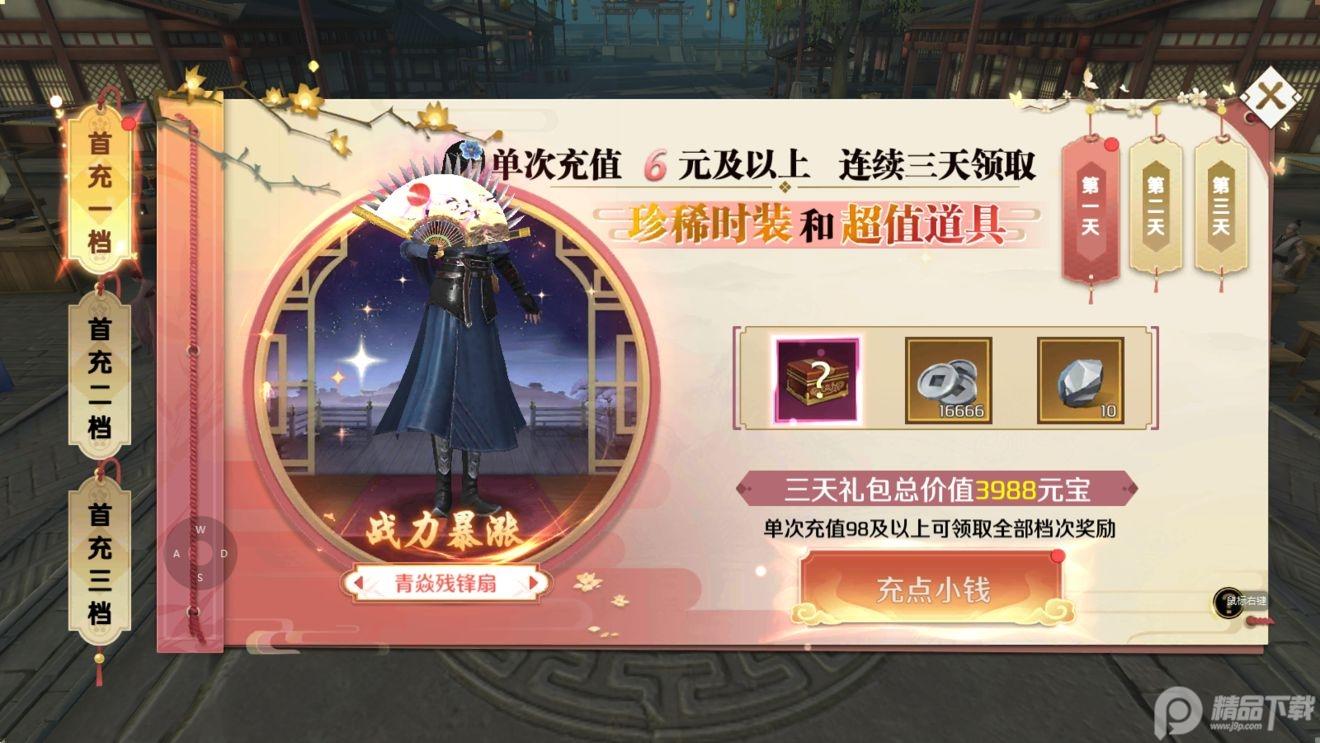 首充6即可立即领取「史诗级武器时装宝箱」、「铜钱*16666」,「羽化石*10」,大幅提升战力,三天礼包累计总价值3988元宝。战力提升,快人一步。
