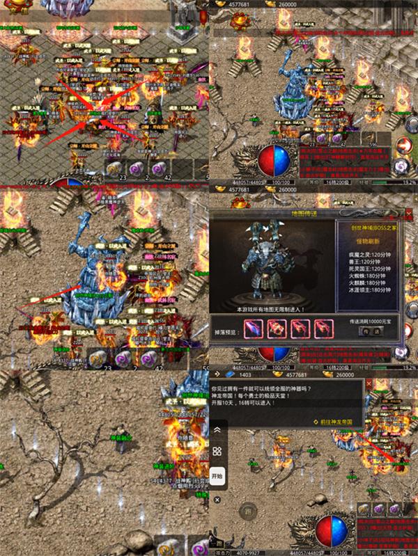 然后是二大陆,二大陆的入口在一大陆的安全区中间,有一个黄色的雕像,大家点一下就可以看到传送了,点击传送就可以到二大陆,二大陆相比于一大陆安全区变小了,周围一圈一共是九张地图,在这里爆的装备都是十转到十八转的装备,二大陆的下方的呢也是两排功能区,7转以上的装备就可以在这里融合了,有神装融合、进阶、溶解、以及生肖的合成,安全区中间呢有两个雕像,最大的那个雕像是二大陆boss之家,里面凶险万分,小的那个是第三大陆入口,需要达到十六转才可以进入哦。