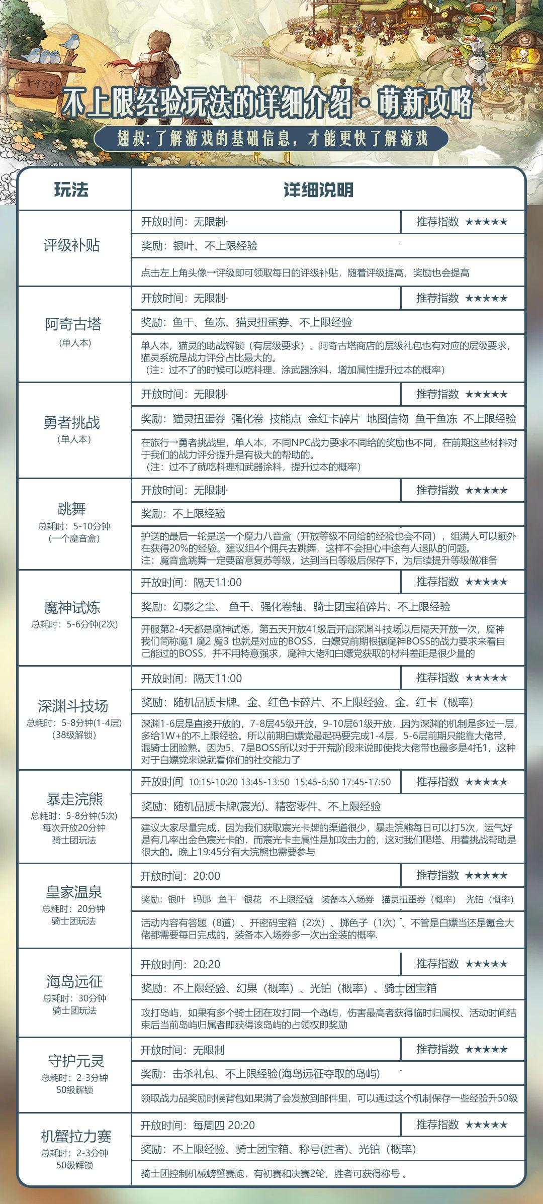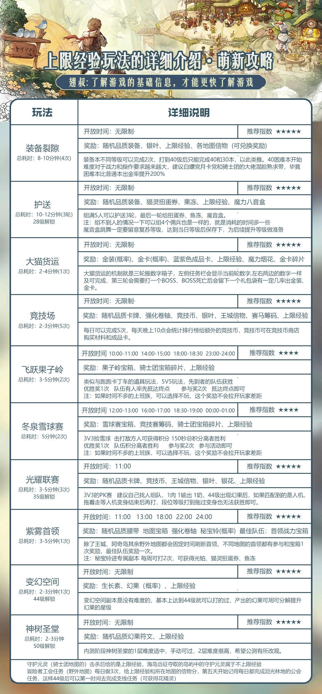 因为森之国度有两种经验,导致很多玩家都会不清楚该如何去选择,毕竟不上限经验对于我们来说是很重要的,如果没有参与到不上限经验的活动,很可能就会出现和大部队玩家拉开差距的风险。所以这边也给大家整理好了两份图片,这些虽然都属于很基础的萌新攻略,但是对于没有玩过森国的玩家来说还是有很大的帮助,可以让大家花更少的时间去了解到游戏的机制