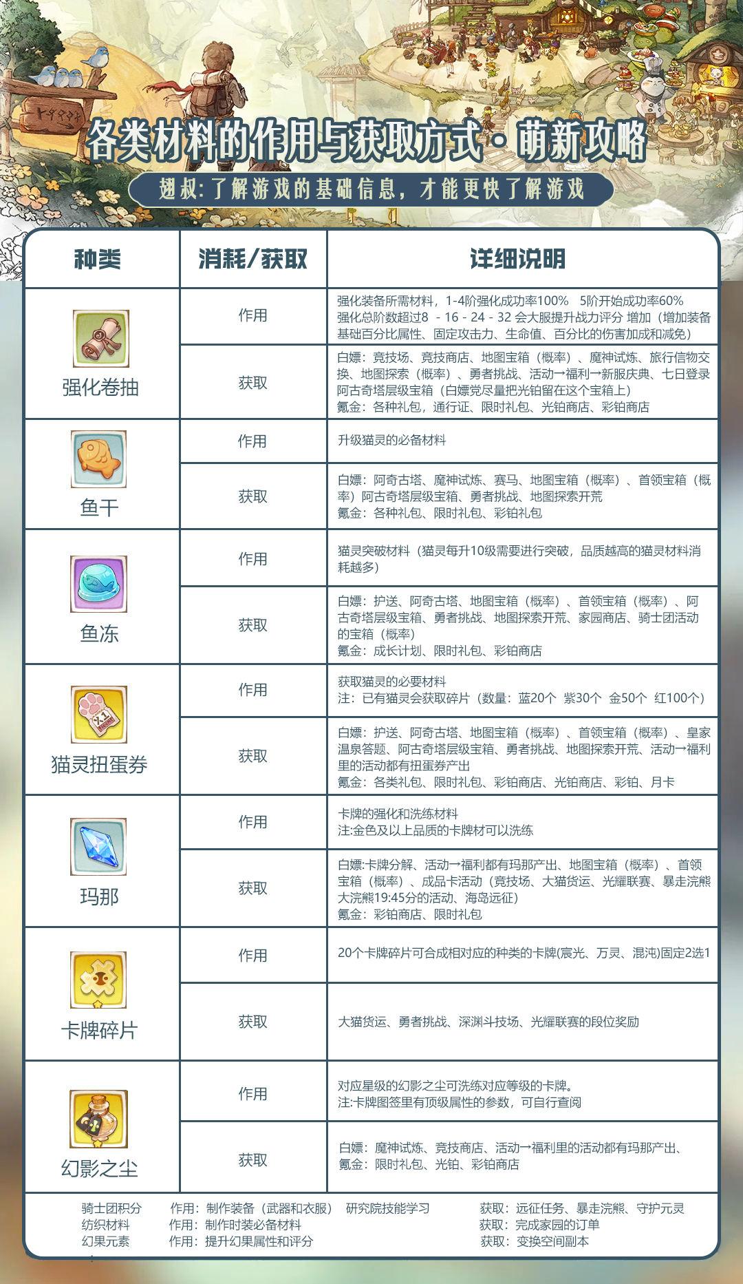 因为不同的玩法,材料也有很多,相信很多玩家在刚进入游戏都会比较懵逼,所以翅叔也把各类材料的作用与获取方式也一并给大家制作出来。