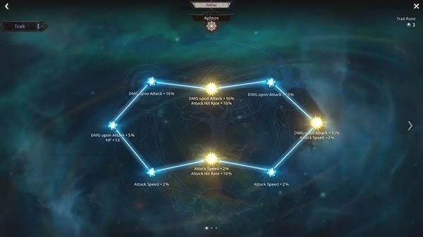 透过黄道宫,可以使用升级获得的属性和天赋点来设定角色。使用特性点数增加力量, 敏捷和智力;使用特性点数增强特定的技能效果。可以使用金币或遗忘星尘来重置黄道宫。