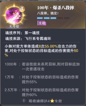 主要输出魂技“爆杀八段摔”在目标异常状态下,会加成伤害50%,因此与唐三搭配,会有加成效果