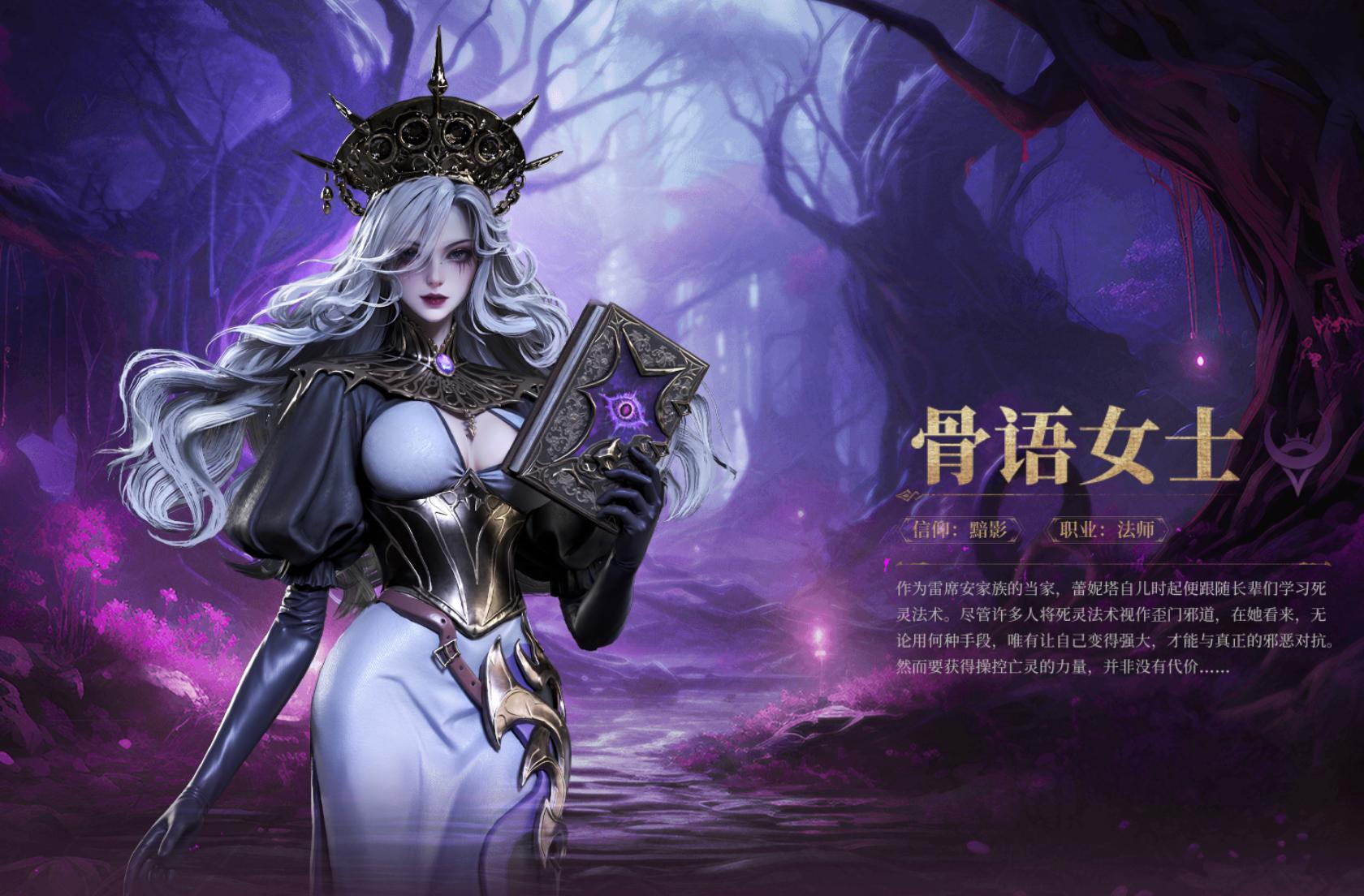 骨语女士(雷妮塔):法术输出天花板,召唤石碑持续伤害,敌人死亡后叠加伤害buff,兼具低血量大招回血的生存机制,适配所有PVE场景。