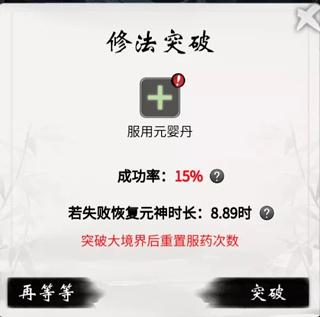 这个阶段应该有手就能修炼上去,需要注意的是每天服药和吐纳有次数限制,突破境界重置次数,所以在炼气的时候尽量把服药次数吃满!并且把100次吐纳次数给吐纳满。长按吐纳到红色箭头所处位置可随机获得2~10倍修为。突破到筑基的天劫很弱,不要浪费机缘买灵盾。