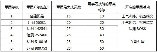 从一级军团升到二级,需要经验56031,军团成员数量可从15增加到20人,可学习技能的最高等级也从10提升到20级,以此类推。小编整理的表格提醒了大家一个铁铮铮的事实——赶紧升级吧!