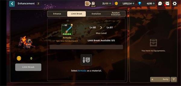 3. 等级突破,需要有相同的武器作为消耗品才能进行,突破5次以后可达上限65级,建议大家可以一次收集6把相同武器,然后花金币全部升到5星,然后选一把最好的,剩下五把就拿来最为突破的消耗品。