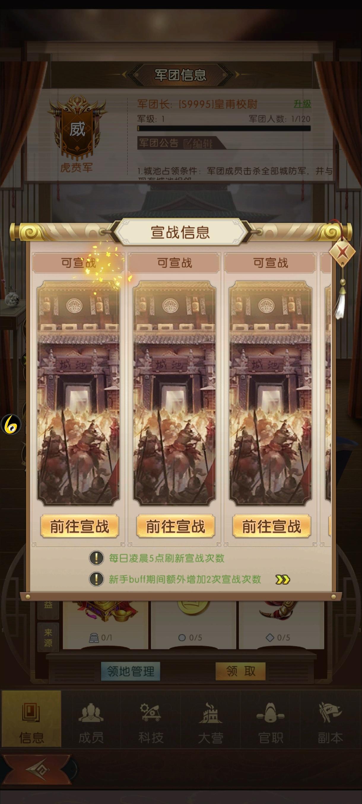 军团长和副军团长可以向已经通关的城池进行宣战,占领的城池越多,每日提供的资源也就越多。