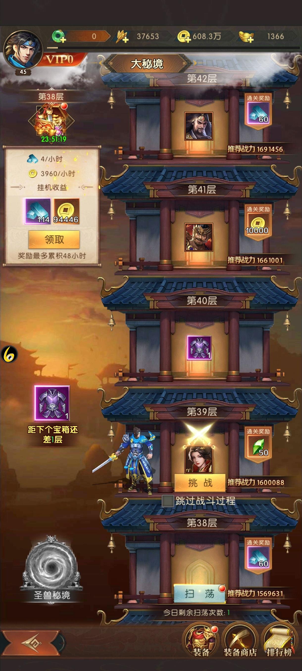 主公在爬塔中获取的装备奖励只有防具类装备,首饰类装备需要在通关爬塔50层后开放的圣兽秘境中获取,圣兽秘境中一共有五只圣兽,对应装备的五个化身,每日主公可以击杀5次化身,次数最多累积10次。