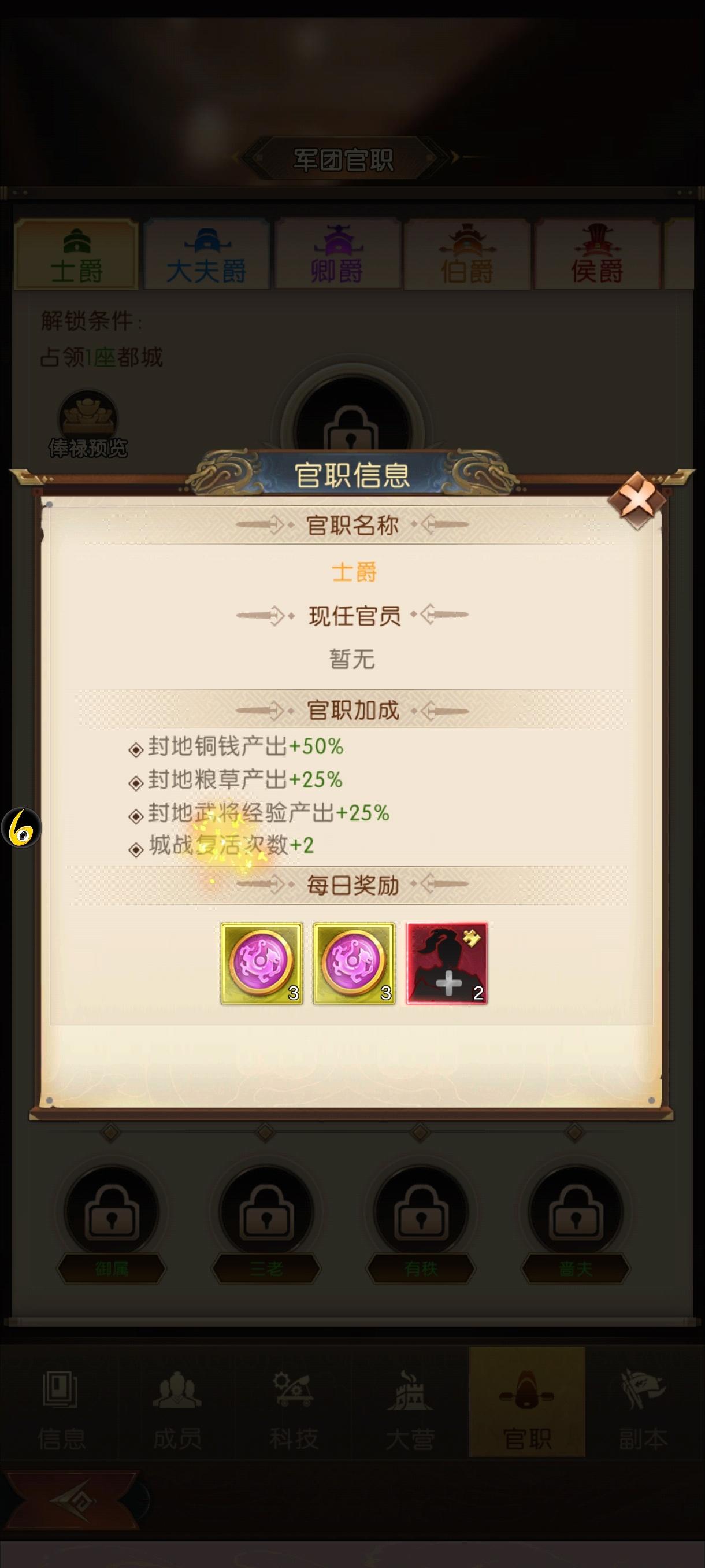 占领一座都城之后解锁官职,军团长可以分配成员的官职大小,不同的官职每天可以提供不同的俸禄,占领的都城越多,解锁的官职越高,每日的俸禄也就越高