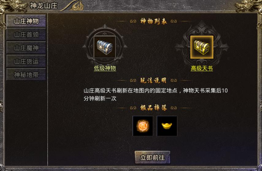 山庄圣物:分为低级圣物和高级天书,高级天书有金木水火土 5 个,采集后 30 分钟刷新,能获取更好奖励;低级圣物刷新较快。