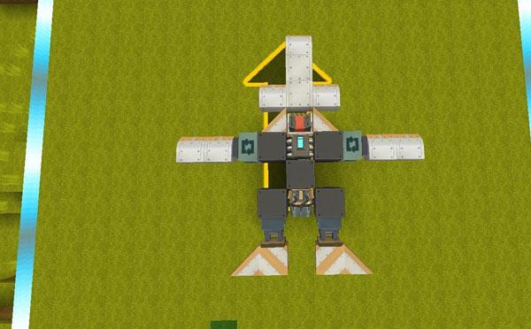 6、最后的安装步骤啦,最后我们需要安装四块尾翼方块,摆放在铰链方块的旋转面,一侧摆放两个,注意摆放的朝向: