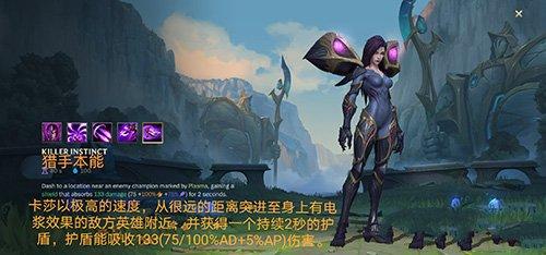 卡莎远距离冲刺到有体表活肤被动的敌方英雄身边,并且获得一层护盾。这里注意了!(敲黑板)大家可以自己手动选择卡莎的落点!所以当你被gank的时候,可以利用这点特性进行躲技能反杀或者是穿墙逃跑!然后还有一个小技巧,利用队友的控制技能可以叠上体表活肤被动的特性,卡莎可以和那些带控制的队友完美配合,决定何时进场输出!