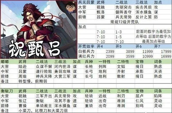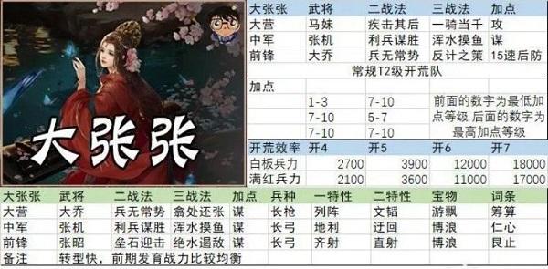 今年3月起,开始流行一支攻守兼备的队伍,大张张,优点数不胜数,但单以开荒角度来说,吃红,战法经验需求多,都是无法避免的缺点,因此我将其排到了