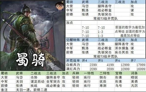 蜀骑,蜀骑自从开发至今从未被主五淘汰过,于是也有了衍生的开荒队,但这个开荒队缺点极其明显,就是缺资源,铁和粮食消耗很高,玩家难以掌握开荒节奏,限制了他进一步提升排名