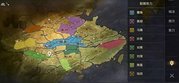 资源州势力:曹操占据大部分资源州,是最强的势力,难度为十级以上(盘踞州府城池十环内),十环外从十级降一级,为九级,再出十环降为八级。每个势力的上限均为自身州府盘踞势力。势力越大,难度越高。