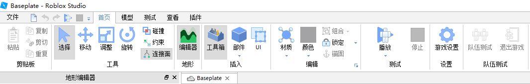 当进入Roblox Studio之后,就可以利用编辑器内提供的部件进行场景搭建,部件选择在编辑器最上方菜单栏——模型——部件进行选择;编辑器内只提供了方块、球体、楔形(三棱柱)、圆柱四种部件,我们需要利用这些部件和游戏内的模型功能拼凑出各种形状;