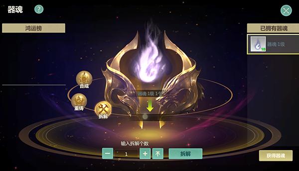 1、可将2个相同等级的器魂进行合成,合成成功就有机会获得更高级的器魂。
