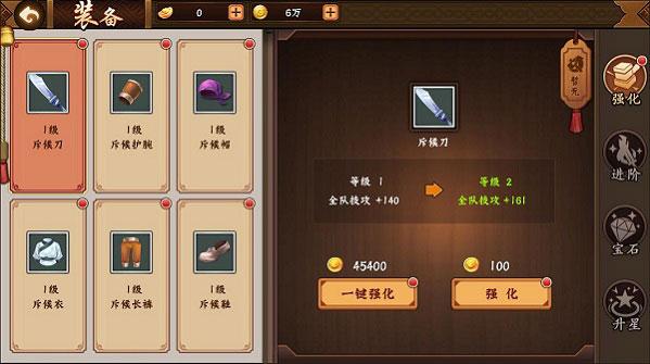 《三国战纪2》的装备有6种:武器、护腕、头盔、盔甲、裤子、鞋子。