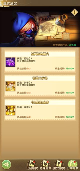 游戏内设置有悬赏酒馆系统,悬赏任务又分为日常悬赏、巢穴悬赏、特殊悬赏和公会悬赏。悬赏玩法中的关卡难度各不相同,可获得的奖励也种类繁多,是玩家常用材料的主要来源。