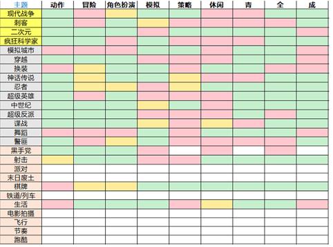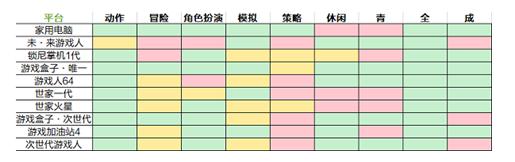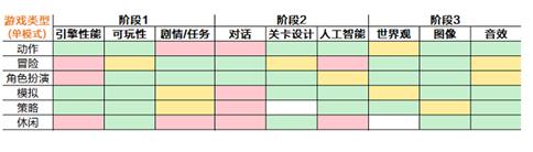 游戏开发大亨最佳搭配表,表中红色代表不可行,绿色代表完美,黄色代表中等