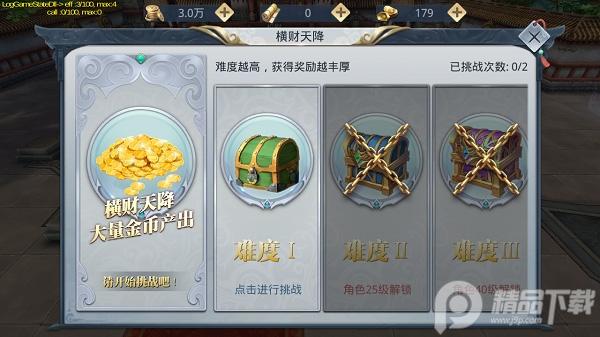 在“竞技”界面可以找到横财天降副本。副本不需要消耗体力,不过每位玩家每天只有两次免费挑战的机会。提升VIP等级的话,每日可以获得更多的免费挑战机会。免费挑战机会耗尽后仍然可以通过扣除“貔貅卷轴”再次进入。横财天降副本要求玩家在60秒内击破含有金币的宝箱,最后按照击破的剩余的血量来结算金币所得。