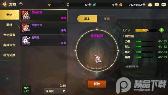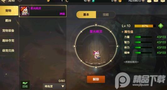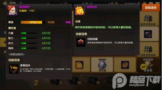 宠物可以给玩家提供额外的属性值(例如图中星光精灵可以给角色提供力量、智力、体力、精神),宠物升级后可以增加给角色提供的属性,提高力量、智力、体力、精神属性,但是每个宠物都有属性上限值(例如图中的宠物满级后只能提供133点力量、智力、体力、精神)。