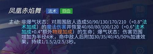 二技能是凤凰赤焰舞,非爆气状态对周围造成魔法伤害并回复自身生命;爆气状态下也一样,不过范围增加并且可以加速