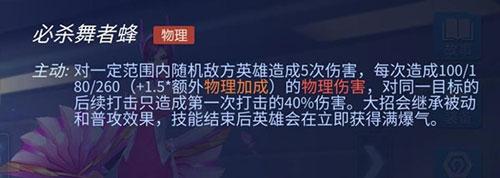 大招是必杀舞者蜂,对范围内随机敌人造成五次伤害,对同一目标只造成第一次的40%伤害,大招结束后,立即满爆气