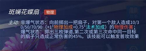 一技能是斑斓花蝶扇,非爆气状态向前方掷出一把扇子,命中造成物理伤害;爆气状态下掷出三把扇子,其实都命中也差不多相当于两把扇子的伤害。此技能能触发普攻效果