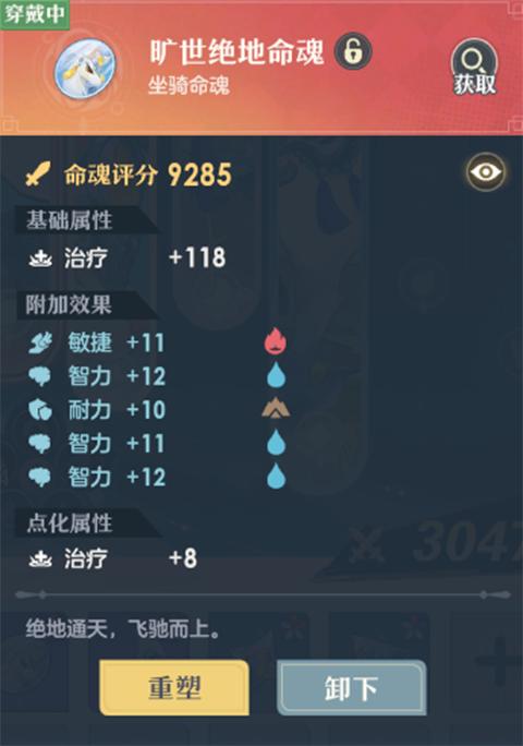 命魂槽位随着坐骑等级的提升逐渐开放,达到8级开放全部命魂槽位。命魂共有6种,可提供主属性加成各有侧重:绝地(物攻/法攻/封印命中/治疗)、翻羽(物攻/物防)、奔霄(法攻/法防)、逾晖(生命/物防/法防)、腾雾(速度/生命/封印抵抗)、越影(速度/封印抵抗)。