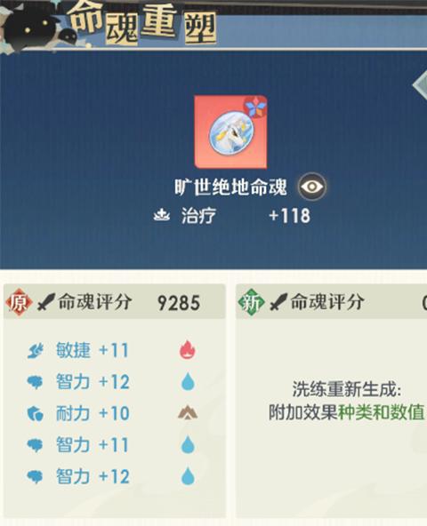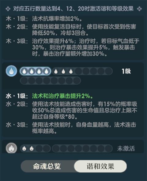 命魂的附加属性会带有随机的五行类型(金木水火土),同一五行类型攒到特定数量(4/12/20)即可激活对应等级的五行谐和效果。