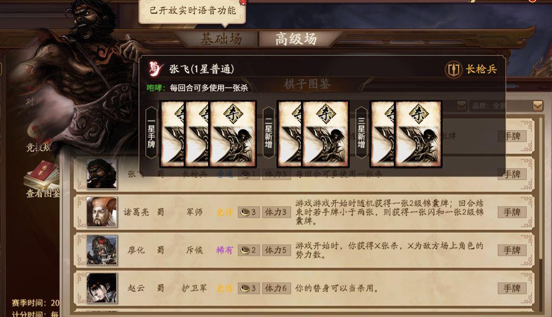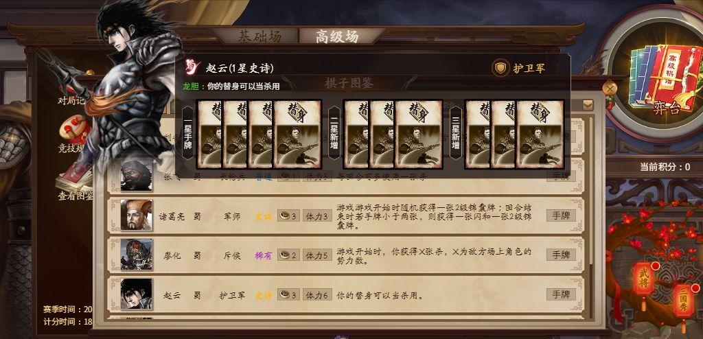 张飞无论几星,手牌全是杀,配合【咆哮】技能通常可以直接秒掉对手,所以也被称为“伪一刀斩”(虽然并不是一刀)。赵云和张飞一样手牌极端,全是【替身】,能作为任何伤害的防御,而且【替身】还可以当做【杀】打出去。前者一刀秒,后者让对方频频秒不掉,这就是蜀国的“中流砥柱”。