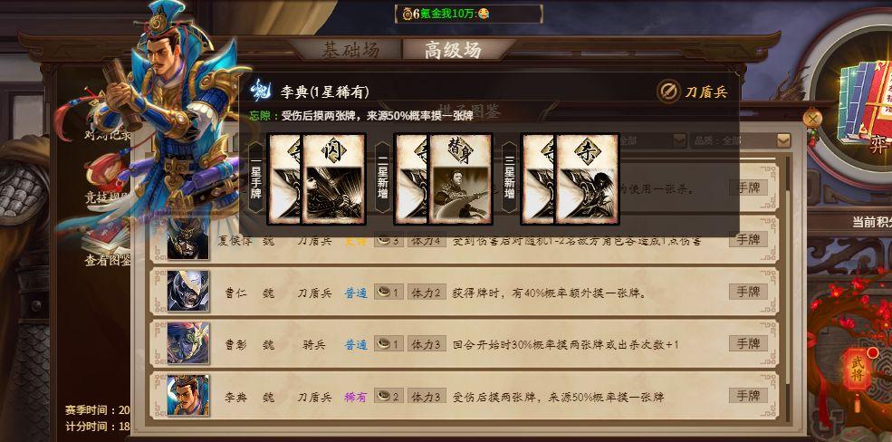 曹仁刷新率高,手牌丰富,二星还有“无中生有”,再加上技能提供的40%额外摸牌几率,即便是遇到张飞这种“伪一刀斩”也能应付。而李典的出众能力也在于摸牌,受伤就能摸两张,后期配合大魏涨血buff,足以让对手难受一阵子。