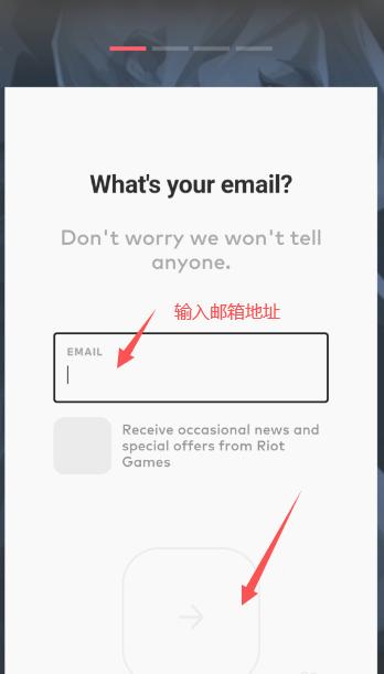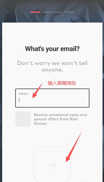 第一步,我们输入自己的常用邮箱。下方的选项大致意思是询问你是否愿意接收拳头的新闻或者其它消息右键,同意就勾选。