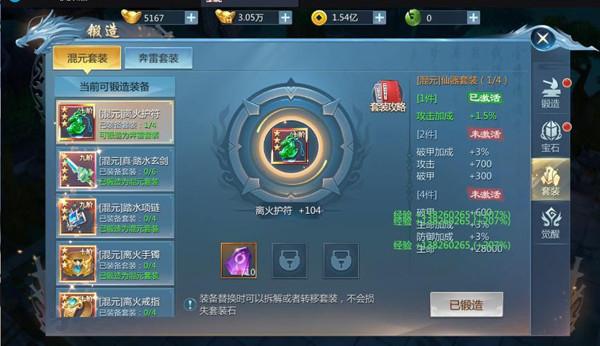 10、套装:等级超过 240 级的少侠可以锻造套装,锻造不同部位的套装需要指定部位的套装石,集齐 2、4、6 件混元或奔雷套装均可获巨额属性加成。