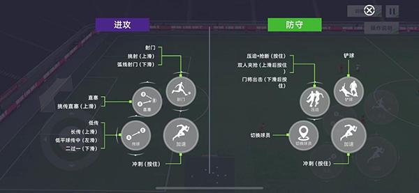 对于双摇杆类型的操作模式,大家肯定不会陌生,大部分的游戏采用的都是这一类型的操控方式,双手操作会更加灵敏一点,左侧是简单的方向盘,右侧则是各种花式进球的操作,点击一下就可以轻松完成铲球、压迫、加速等不同的花样,这些快捷键位的组成,让进球变得更加轻松。