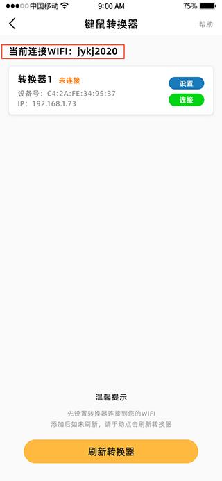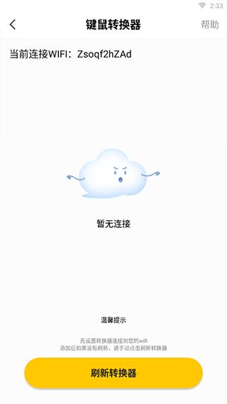 返回APP,检查键鼠转换器连接WIFI是否成功,如图所示(连接成功未出现转换器,请点击【刷新转换器”】按钮)。此时重新连接即可在云电脑/云游戏中使用键鼠啦~