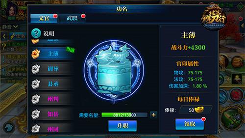 游戏中,功名分为文官和武职两种,而相对应的提升官职则需要通过不同的途径。文官从白身直到帝师,中间有十几个等级,每个等级官印都可以加战力和角色属性;武官是从平民到大将军王,同样中间也有十多个等级,每一级都有强力的属性加成和战力加成。每日你都可以在功名之中领取文官和武职的俸禄,升级可以领取两次哦。