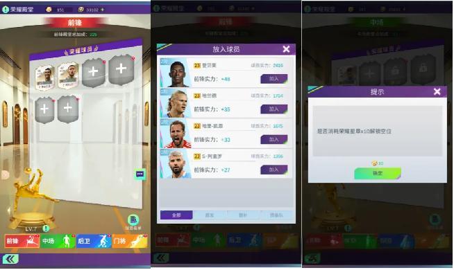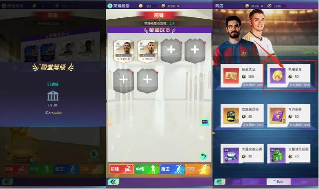 每页初始提供了2个空位可供各位经理放入自己的荣耀球员哦~开启剩余4个空位则需要花费荣耀星章进行解锁,荣耀星章单价为100金球币,开启一个位置分类下的所有空位花费共计100荣耀星章(首个空位解锁仅需10荣耀星章,后续空位解锁道具消耗增加),参与杯赛获取的杯赛币可在杯赛商店内进行荣耀星章兑换。