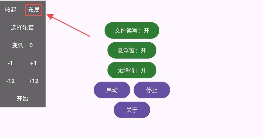2、进入游戏后,点开悬浮按钮,首先点击布局,创建游戏里面弹琴的布局