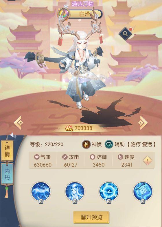 复活己方单位,并恢复其等同于白泽攻击200%的气血;若己方无死亡单位,则为气血比例最低的单位恢复等同于白泽攻击270%的气血(3级)
